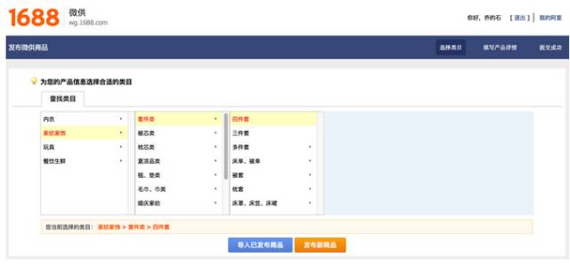 供应商首先选择商品类目(当前微供只为供应商开放四个一级类目内衣、餐饮生鲜、玩具、家纺家饰进行商品发布),完成类目选择,则点击“发布新商品”按钮,进入到商品信息填写页面。