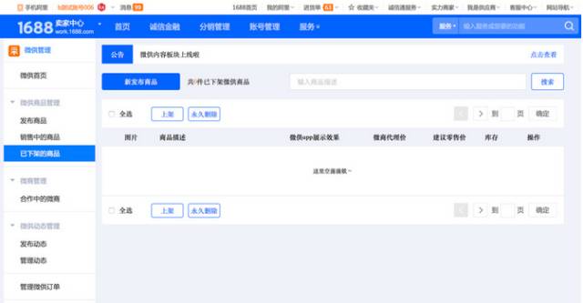在已下架的商品页面中,供应商可以看到自己已下架的微供商品,通过与销售中的商品进行类似操作,也可对商品进行上架和删除操作。