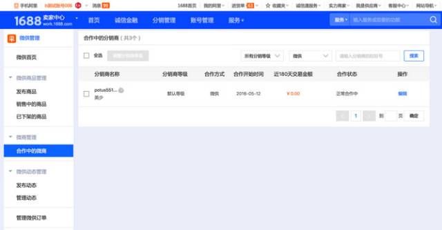 在合作中的微商页面,供应商可以查看到自己所有的微商代理;点击后面的“编辑”按钮,可以对每个微商名称进行备注,保存后备注名会出现在用户名下方。