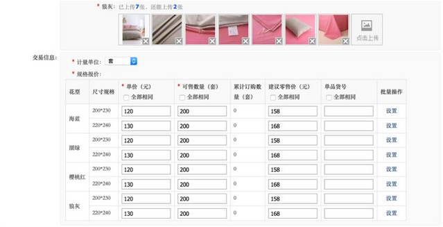然后填写“产品规格”,及产品的规格属性,当前产品规格至少填写一项,否则商品无法填写价格。当填写或选择了产品规格之后,下方会自动出现上传图片和交易信息模块。